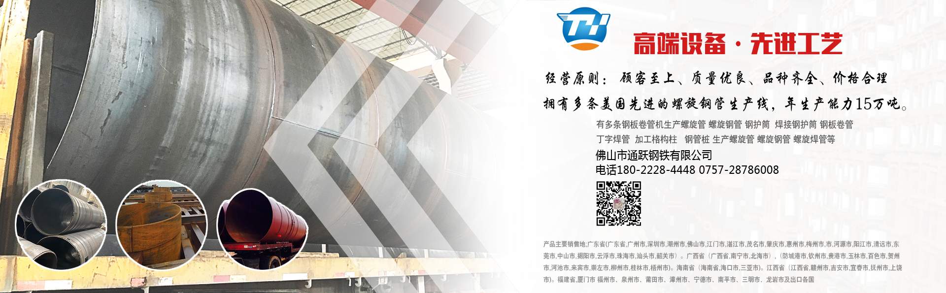 佛山市通躍鋼鐵有限公司 電話180-2228-4448 0757-28786008 擁有多條美國先進的螺旋鋼管生產線,生產直徑φ159-φ3620mm(壁厚6mm-20mm)的雙面埋弧螺旋焊鋼管,年生產能力15萬噸。 生產螺旋管 螺旋鋼管 螺旋焊管 規格厚度6mm-20mm 直徑159mm-3620mm 有多條鋼板卷管機生產規格厚度6mm-70mm 直徑400mm-5020mm 螺旋管 螺旋鋼管 鋼護筒 焊接鋼護筒 鋼板卷管 丁字焊管  加工格構柱 鋼管樁 材質Q235B Q345B Q235A 45# 20# Q420D Q390··· ……